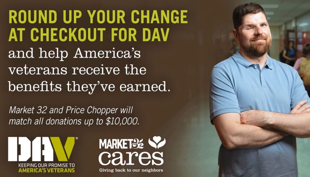 In addition to honoring service members with savings, Market 32 and Price Chopper are once again partnering with DAV to raise funds that directly support veterans and their families. Throughout November, customers can round up their totals at checkout, with 100% of donations going to DAV.