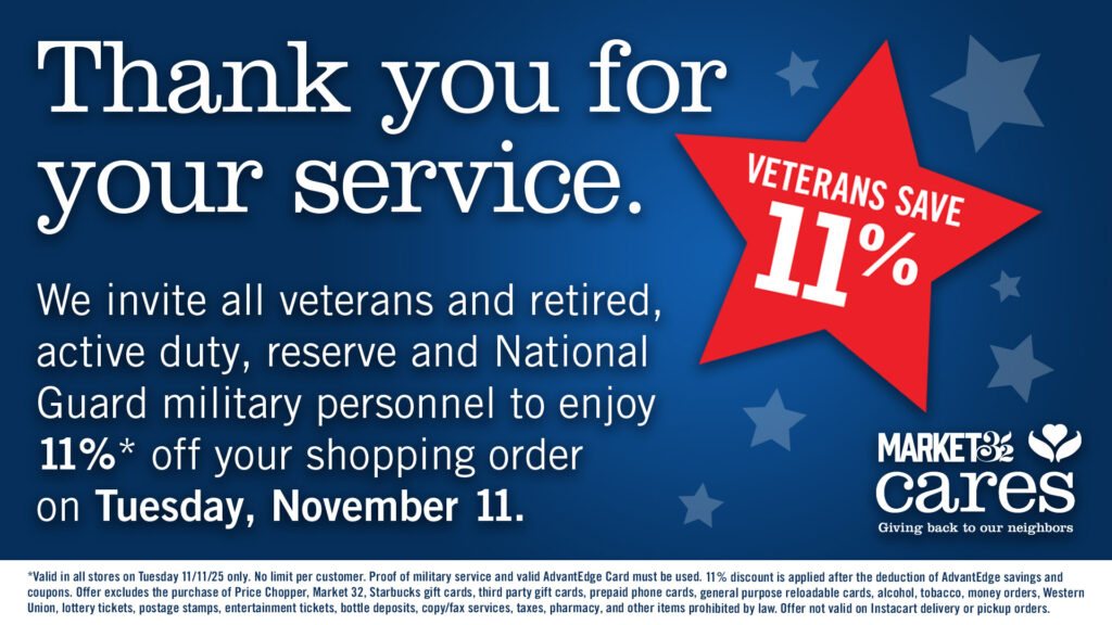 “We have deep respect for those who have served our country and are proud to recognize their courage and commitment to protecting our freedoms,” said Blaine Bringhurst, president of Market 32 and Price Chopper. “This offer is one small way for us to thank members of our military, veterans, and their families for their service and sacrifice.”