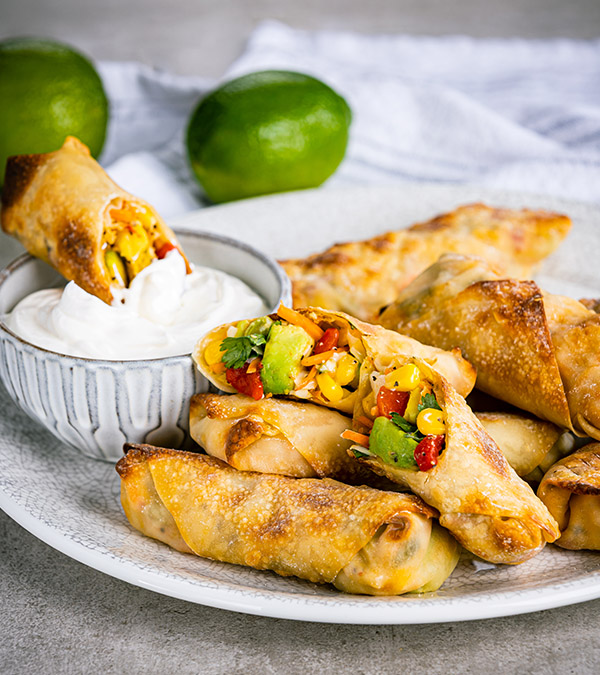 These egg rolls are filled with a creamy, fresh mix of ripe avocado, mozzarella, roasted red peppers, corn, carrots, green onions, cilantro and lime juice to give them a vibrant flavor. They’re air fried until golden and crisp (no deep-frying needed), and serve nicely with sour cream for dipping.