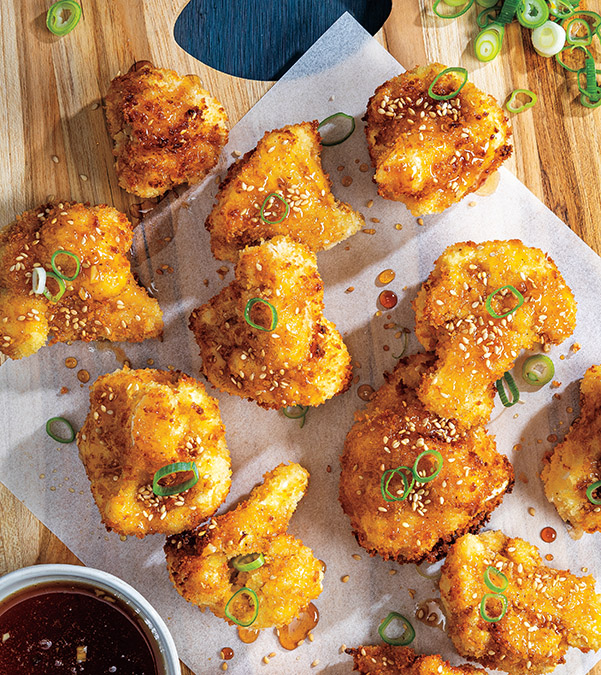 These “wings” use cauliflower florets breaded with flour, eggs, and panko, then air-fried until crisp and golden. They’re tossed in a sticky sauce made with honey, soy sauce, rice vinegar, sesame oil, garlic and fresh ginger, then finished with green onions and toasted sesame seeds for flavor and crunch.