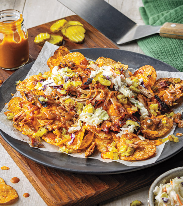 These nachos layer BBQ kettle chips with shredded Cheddar cheese, pulled pork, and Carolina-style barbecue sauce, then are grilled (in a foil pan) until the cheese is perfectly melted and the pork is heated through. Topped off with creamy coleslaw and sweet & tangy bread & butter pickle chips, they offer a satisfying crispy-rich combo of textures and flavors.