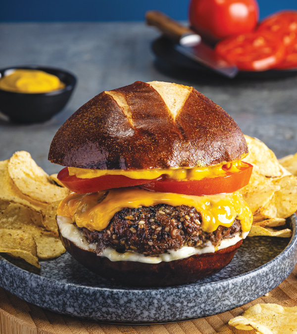 These Everything Cheeseburgers are seasoned with an “everything” bagel-style spice blend mixed right into the ground beef, then grilled and topped with cheddar cheese and juicy slices of tomato. They’re served on toasted pretzel rolls with mayo on the bottom bun and mustard on the top—simple condiments letting the seasoned meat and hearty bun shine.