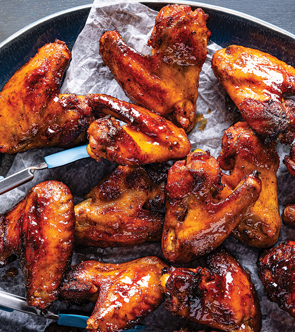 Chicken wings marinated in a flavorful mix of apple cider vinegar, maple syrup, sriracha, soy sauce, garlic, and warm spices like cinnamon, allspice, and nutmeg. After roasting until golden, the wings are brushed with a butter-enriched glaze for a sticky sweet-heat finish.