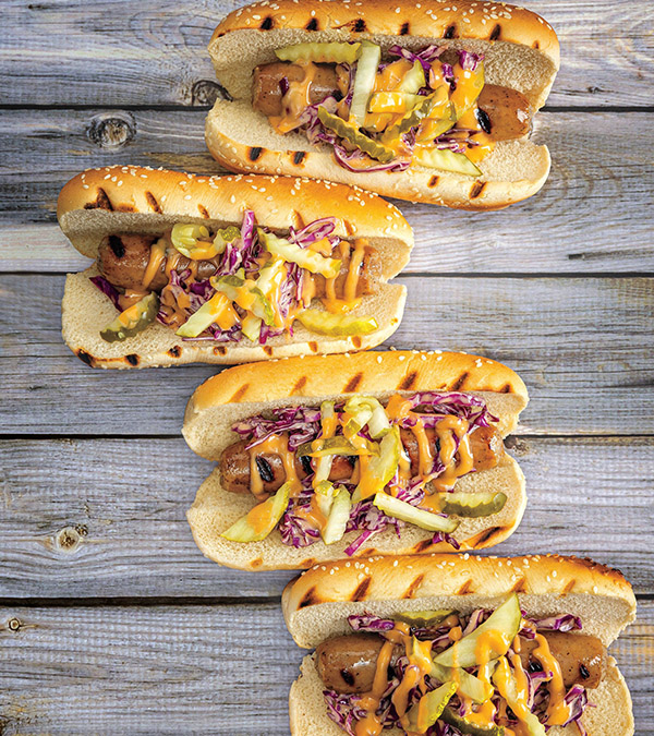 These “Yum Yum Brats” are grilled stadium bratwurst cooked until nicely charred and juicy, then nestled into hoagie rolls that are also given a quick toast on the grill. They’re topped with a crunchy slaw made of red cabbage mixed with a creamy “yum yum” sauce and finished off with tangy bread & butter pickle chips for a sweet-and-savory bite.