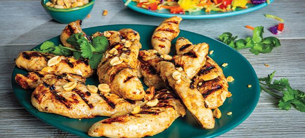 Grilled Thai Peanut Chicken Tenders with Pepper-Broccoli Slaw: Thai peanut chicken is a dish that originates from Thailand, where peanut sauces are commonly used in various recipes. The dish typically features chicken cooked in a rich, creamy peanut sauce made from ground peanuts, coconut milk, and a blend of spices. This sauce is often paired with vegetables and served over rice or noodles. The use of peanuts in Thai cuisine can be traced back to the influence of Chinese cooking, as peanuts were introduced to Thailand through trade. Over time, the dish has gained popularity worldwide, especially in Western countries, where it is often adapted to suit local tastes.