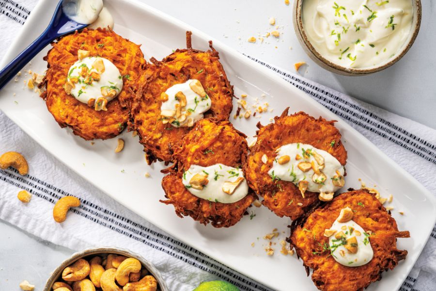 Sweetpotato Latkes with Honey-Lime Yogurt & Cashews