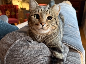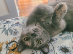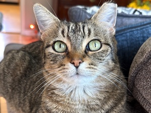 Luna was rescued in November of 2021. She is by far the sweetest girl ever, chirps instead of meows, and greets you right at the door. Luna loves people and will kiss you if given the opportunity! Her favorite thing to do is wake her family up at 4:00 AM for breakfast each morning by zooming around the house.
