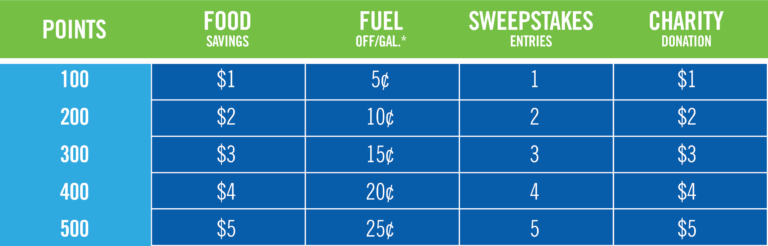 100 points = $1 toward groceries and charities, OR 5¢ off a gallon of gas* OR 1 sweepstakes entry
